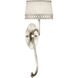 Sconce in a platinized silver leaf finish with subtle brown highlights and white textured linen shade with pierced metal gallery in matching silver leaf finish.
